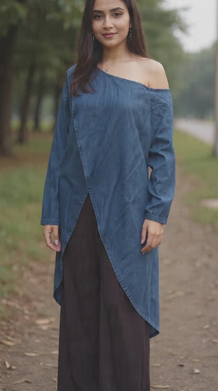 This denim top brings effortless edge to your everyday fit. You get a one shoulder neckline that feels modern and confident. The soft washed denim stays light and breathable, so you stay comfortable all day. The wrap style front shapes your waist without feeling tight, while the longer back hem gives clean coverage. Full sleeves balance the look and make it easy to wear across seasons. Pair it with jeans, flares, or boots. It works when you want to look put together without trying too hard. Clean look. Strong vibe.