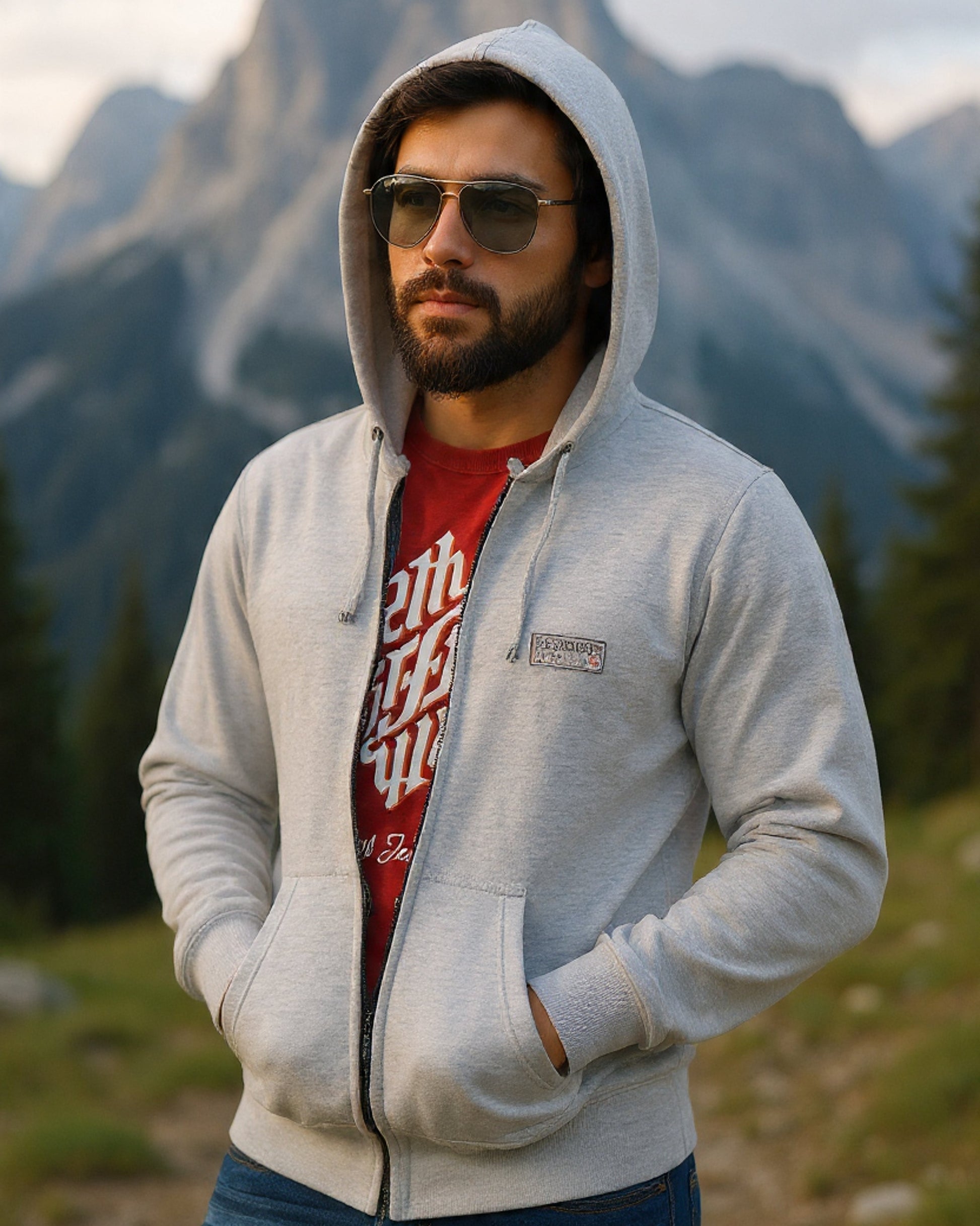 Uni-Sex Heather Grey Zipper front Fleece Hoodie With Kangaroo Pocket. These hoodies are made using heavy weight 80% Cotton / 20% Polyester fabric with logo insignia on chest and Wing Print on the Back to give it a unique look.
